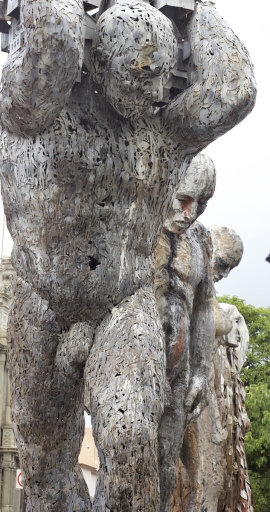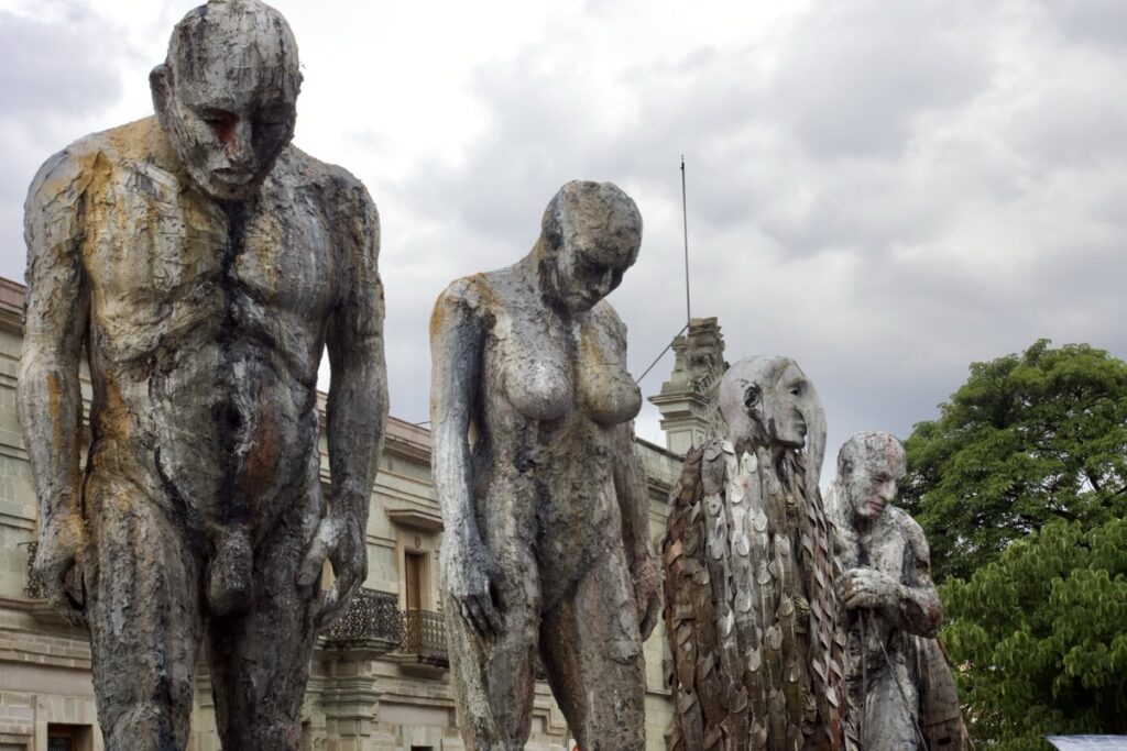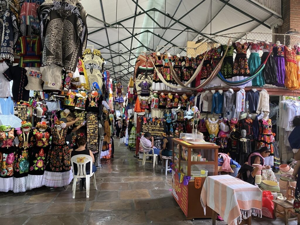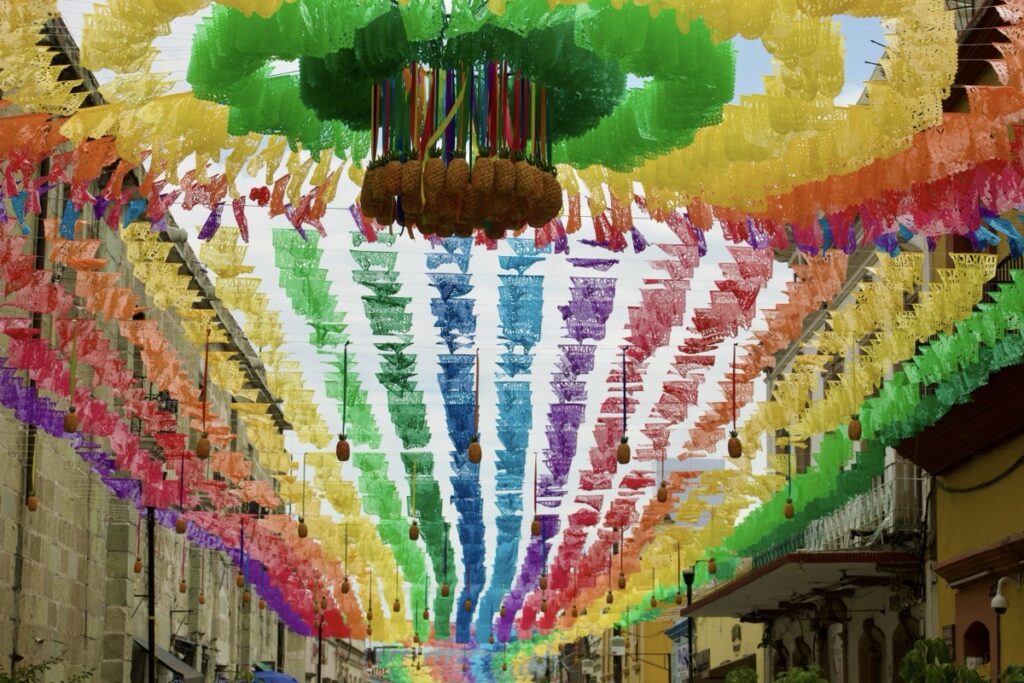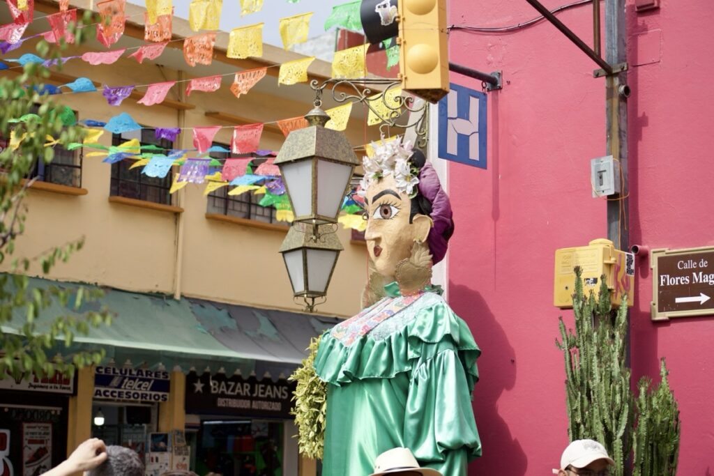 OAXACA, superbe ville au sud est de Mexico city et capitale de l’état de … OAXACA 🫤. C’est aussi la capitale du mezcal, alcool fort qui peut être très bon, préparé à base de cactus. Nous sommes en pleine période de fête ce qui explique que nous n’y ayons passé qu’une journée, la deuxième a en effet, consistée à être bloqués dans des embouteillages monstres sans jamais réussir à atteindre la vieille ville . Et conduire dans des embouteillages au Mexique, c’est épuisant !