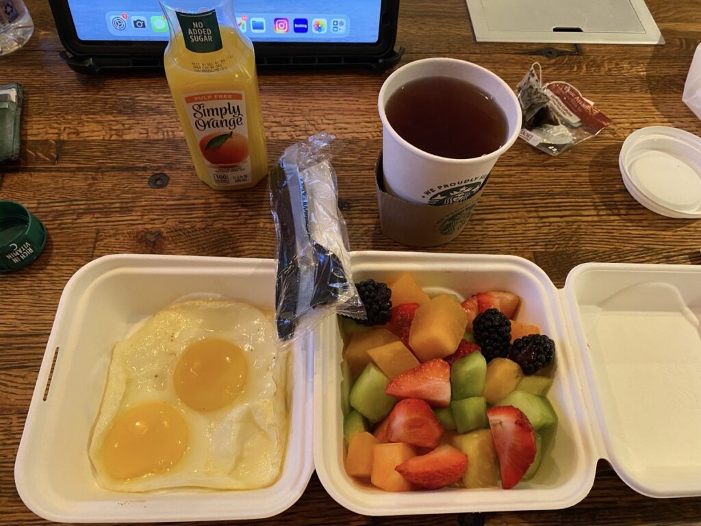 Oui, vous avez bien vu: des œufs au plat dans du polystyrène c’est… moyen et donc j’ai commandé des toasts, vous savez du pain carré et farineux, légèrement sucré et grillé avec un peu de beurre fondu dessus, livré avec un petit blister de confiture de fraise… à 2 dollars la tranche mais je ne l’ai su qu’après avoir commandé, je suis naïf 😬, j’en avais demandé 4 !