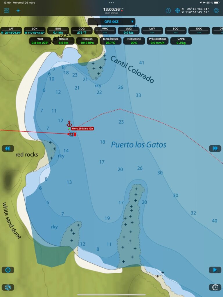 Du vent au départ, nous avons pu naviguer 1h30 à la voile, ça fait du bien 🤩 Arrivée à 12h30 mais après 2 tentatives de mouillage ratées… le fond remonte très rapidement .