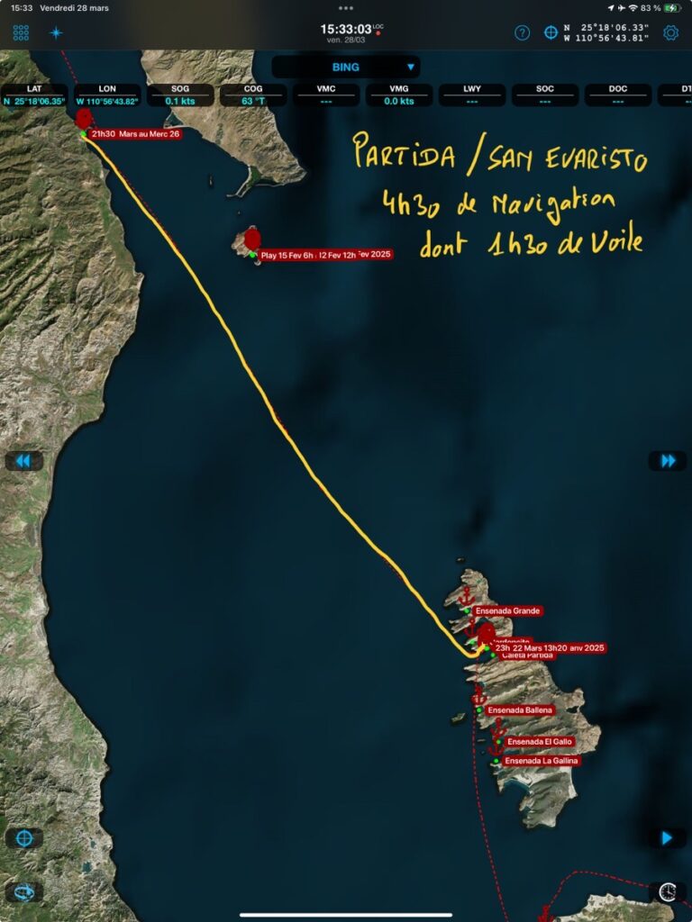 nous n’avons pas fait de photos cette fois ci, vous en trouverez dans les articles precedents. Il y avait 15 voiliers et un immense yacht, pas d’intérêt. Le lendemain matin nous partons pour San Evaristo qui est la limite de notre zone déjà explorée.