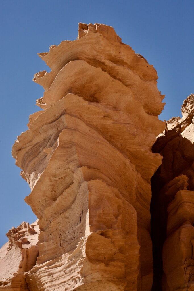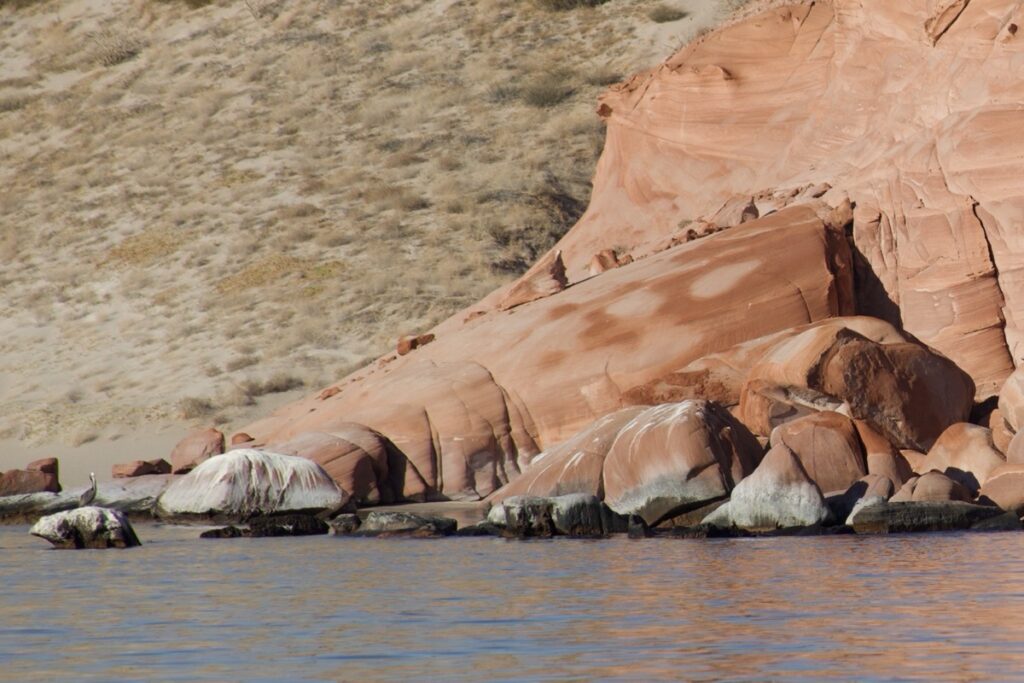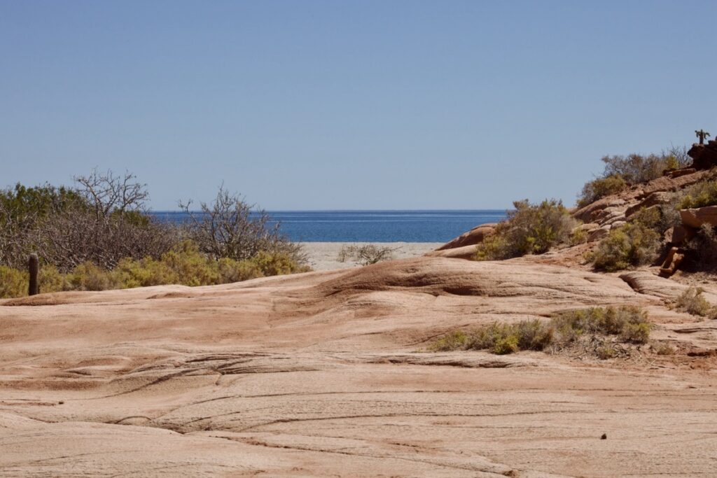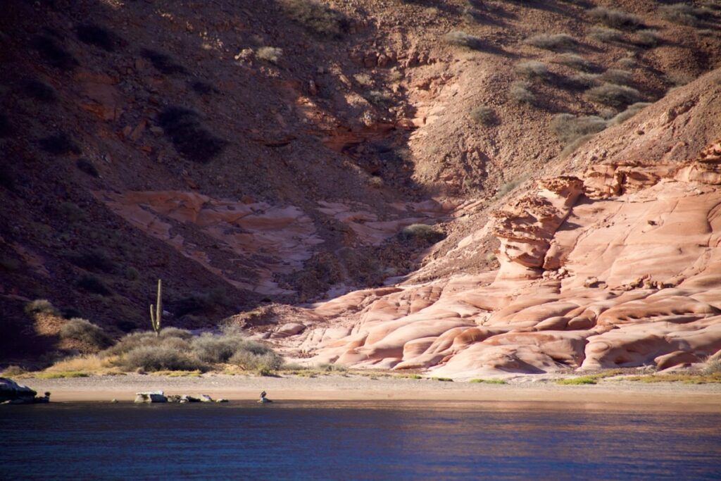 Cette petite baie est superbe avec des rochers rouges et le désert juste derrière :